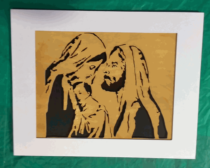 Scrolled from 1/8" thick Baltic Birch plywood and matted for mounting in an 11 x 14 frame. Shown with a simple Dollar Store frame(not included).