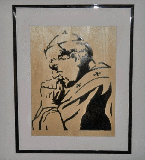 Scrolled from 1/8" thick Baltic Birch plywood and matted for mounting in an 11 x 14 frame. Shown with a simple Dollar Store frame(not included).
