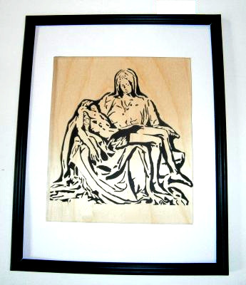 Scrolled from 1/8" thick Baltic Birch plywood and matted for mounting in an 11 x 14 frame. Shown with a simple Dollar Store frame(not included).