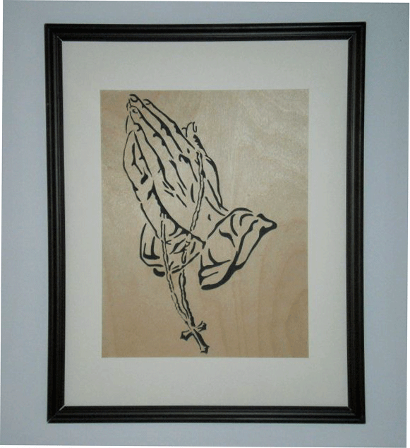 Scrolled from 1/8" thick Baltic Birch plywood and matted for mounting in an 11 x 14 frame. Shown with a simple Dollar Store frame(not included).